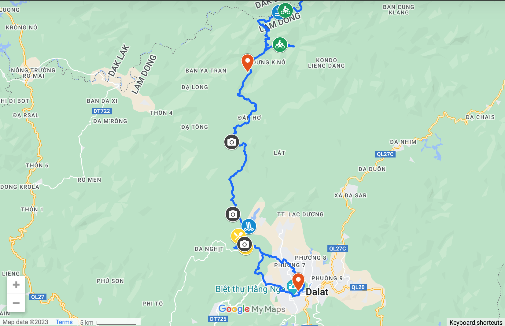 Nevertheless, this particular segment remains unfinished, culminating after crossing a captivating river approximately 70 kilometers north of Dalat. Despite being a (rather lengthy) one-way venture, the experience proves its worth, given the breathtaking vistas, the opportunity to swim in the river's inviting waters, the sheer joy of unhindered riding, and the rare solitude on the road. Just ensure you're well-equipped with sufficient fuel, as the only refueling point is the village of Đưng K’Nớ.
