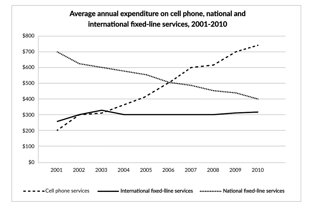 The graph below shows consumers’ average annual expenditure on cell phone, national and international fixed-line and services in America between 2001 and 2010.
